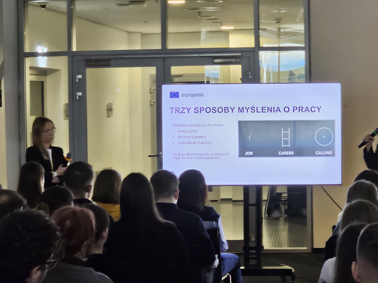 Podczas wykładu uczestnicy dowiedzieli się, jak przedstawiać o swoje umiejętności, by przyciągnąć uwagę rekruterów. Zdradziły również kilka praktycznych, czasem nieoczywistych trików: np. jak stworzyć profesjonalne portfolio online z wykorzystaniem Europass (i wyróżnić się spójnym, estetycznym zestawem dokumentów) czy jak Euroguidance może pomóc w zaplanowaniu ścieżki kariery – zarówno w Polsce, jak i w innych krajach Europy. Nasze prelegentki podkreślały, że planowanie kariery to proces, w którym warto korzystać z dostępnych narzędzi i sieci wsparcia, aby świadomie kierować swoim rozwojem.